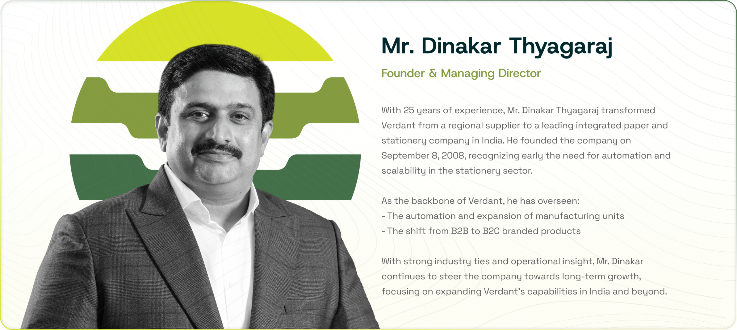 • From a modest beginning in South India to becoming one of India’s most trusted and vertically itegrated Stationery and Paper manufacturers, Verdant Stationery Pvt. Ltd. has been a journey of Integrity, Innovation, and Impact.